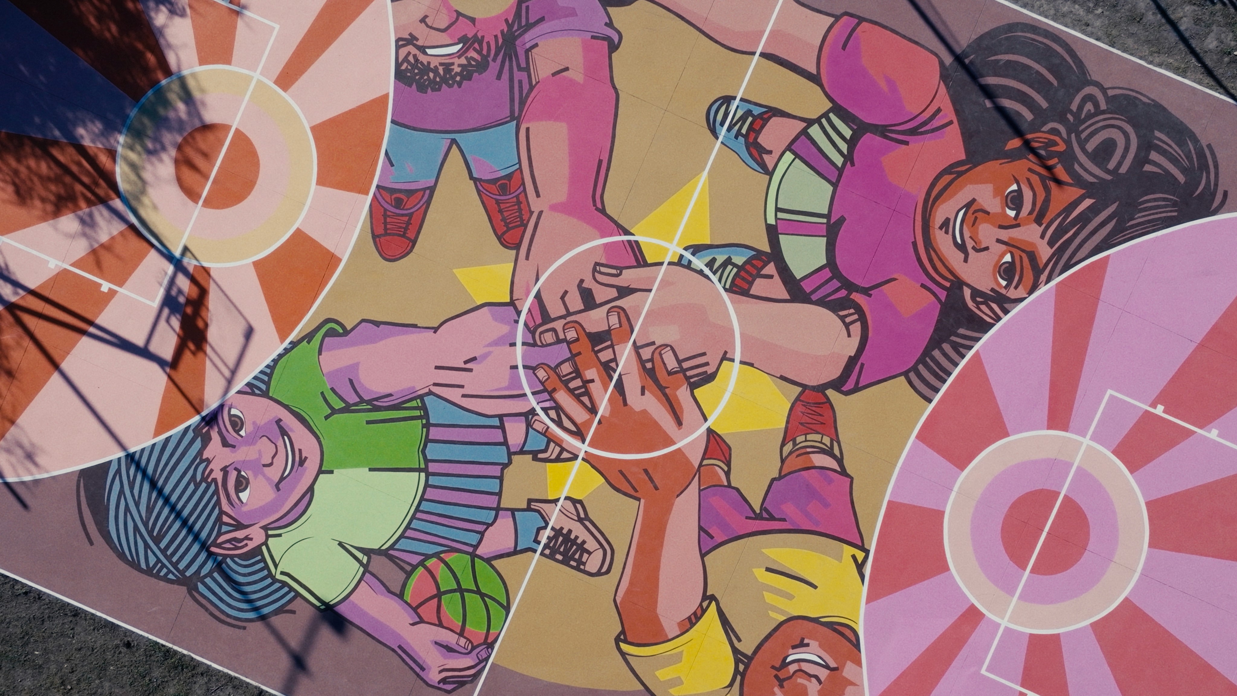 Together with local residents, the team transformed a worn-out court into a gathering point. The goal wasn’t just aesthetic — it was emotional: to reconnect people through memory, color, and common ground.
